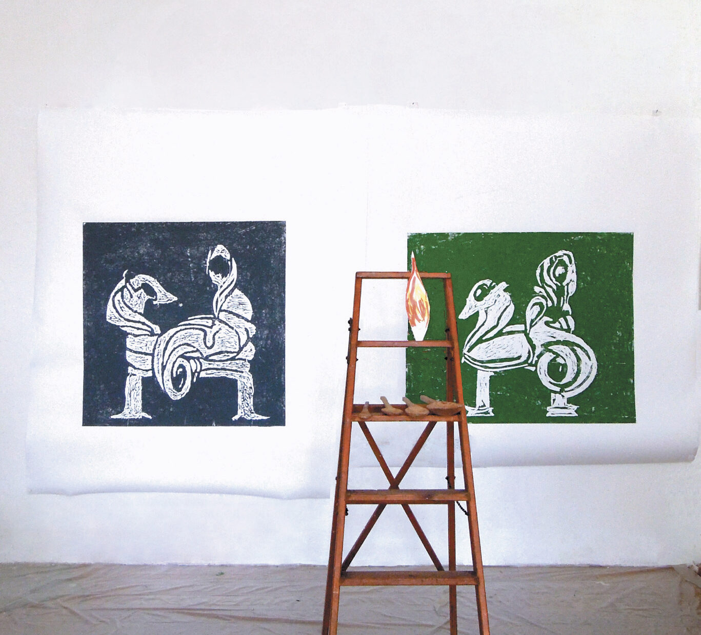 woodblock prints on paper, ladder, wooden spoon and paper flame