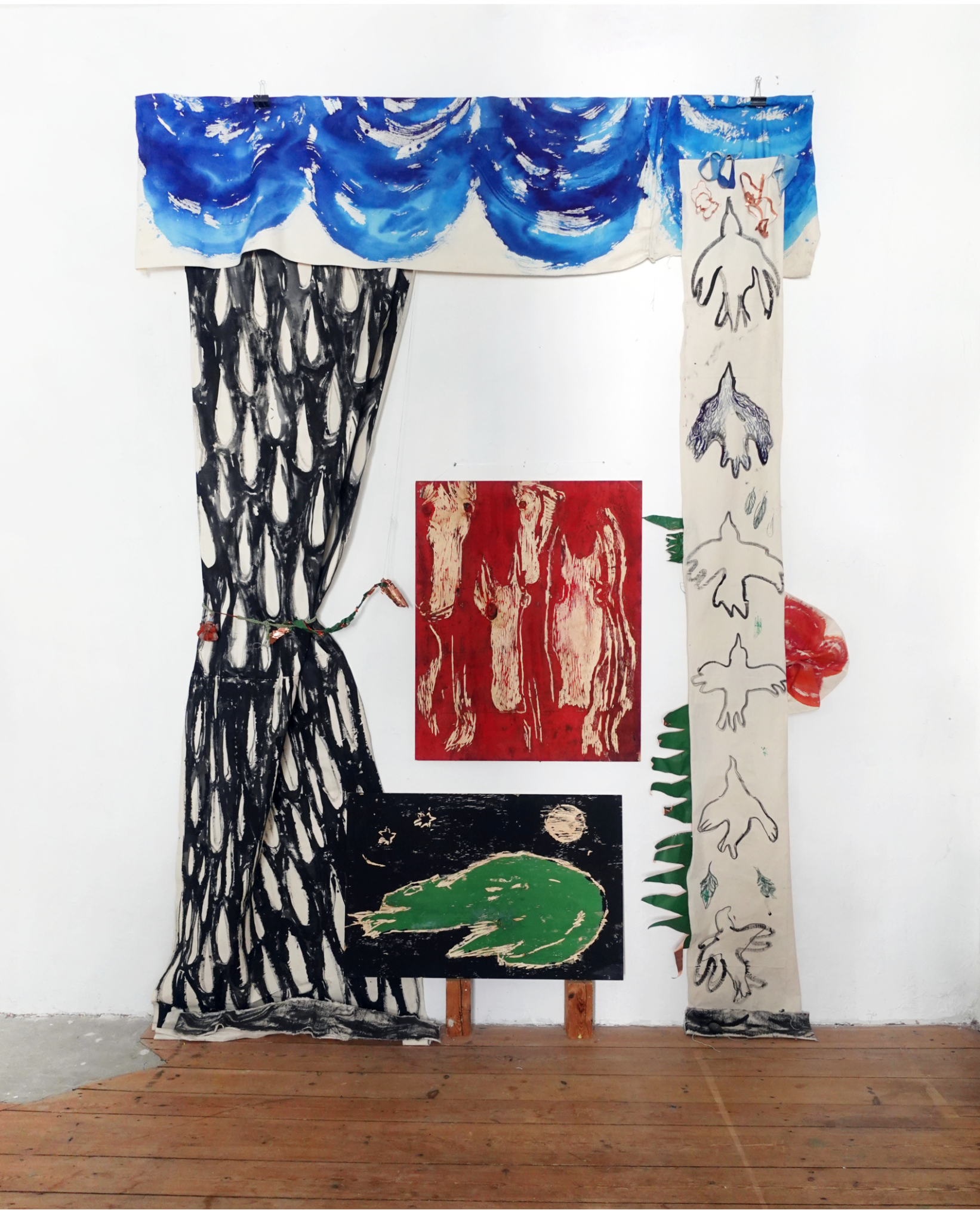 Colored wooden printing blocks, ink and gouache on canvas, copper plates, cord