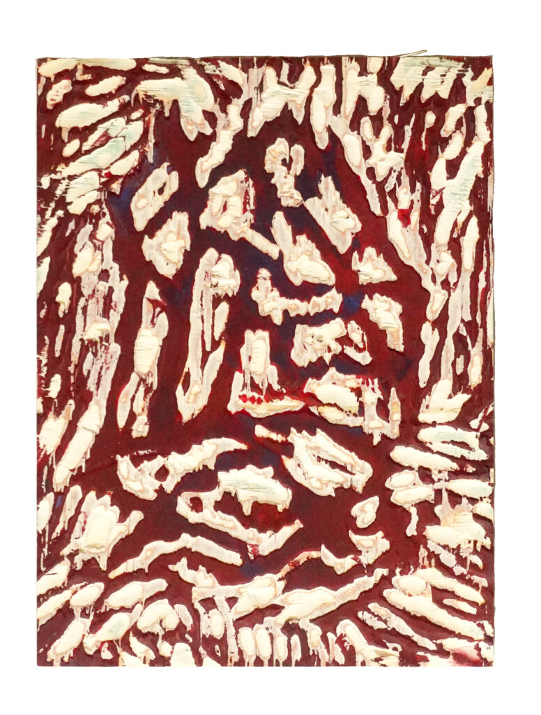 The mixed-media work “Corazón” (Spanish for “heart”) features as its central motif a detailed, intricate drawing of a bleached, dead coral in black and white. Above the drawing, a red, heart-shaped ribbon hangs down, touching the top of the coral.