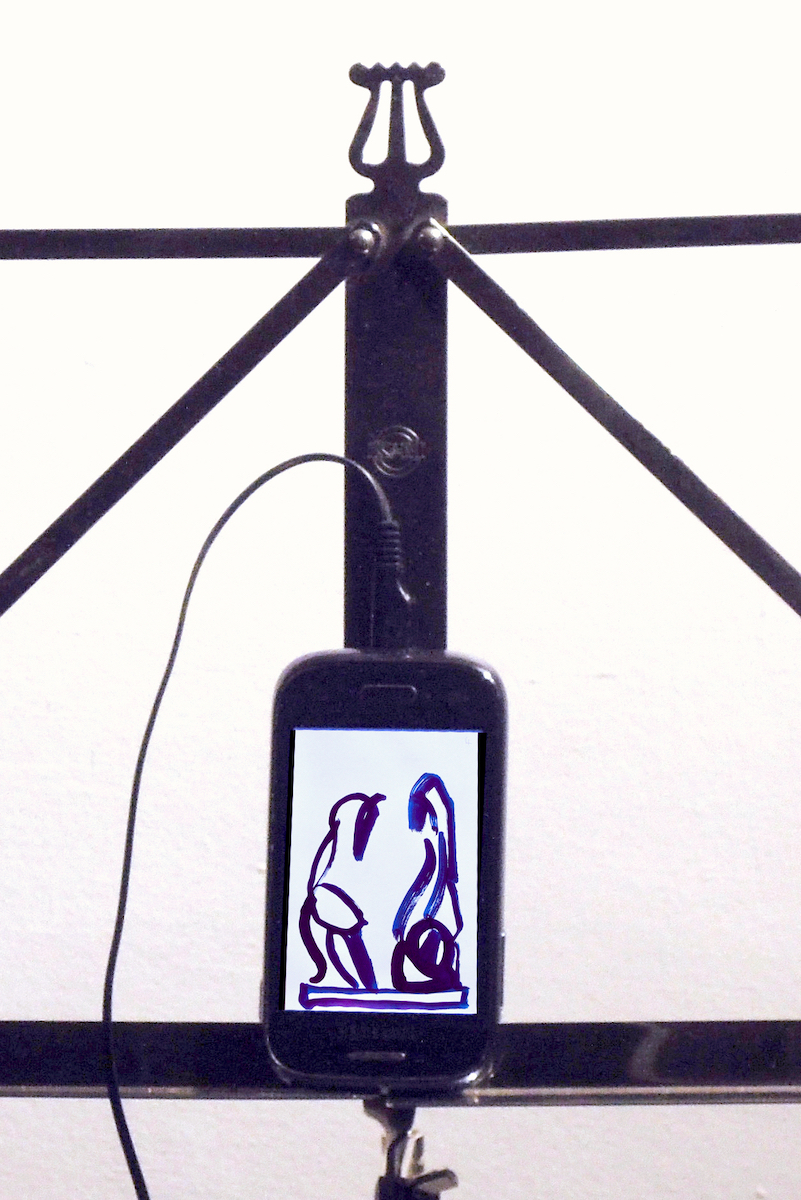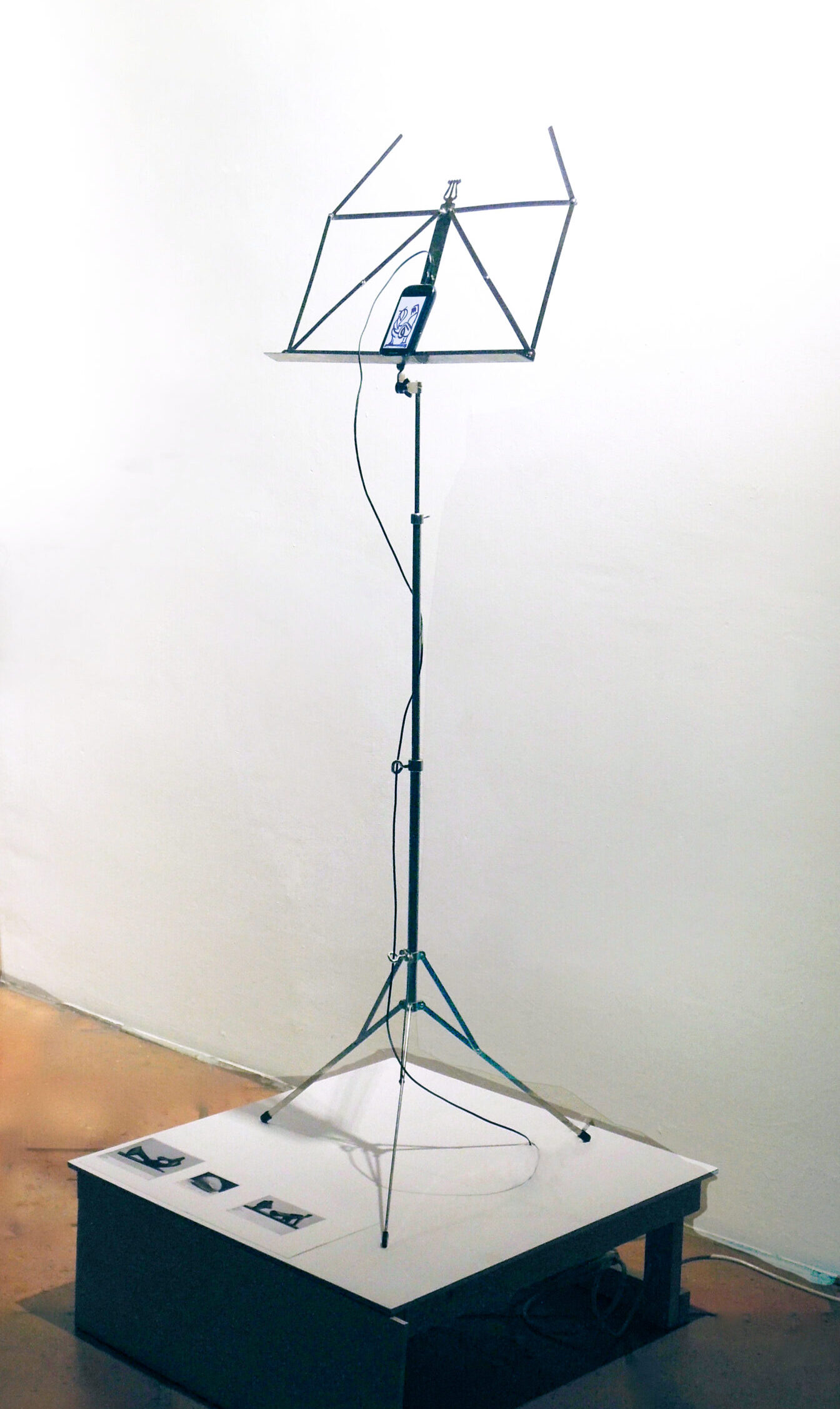 Installation with animated films on a smartphone, music stand, pedestal with images of the original sculptures
