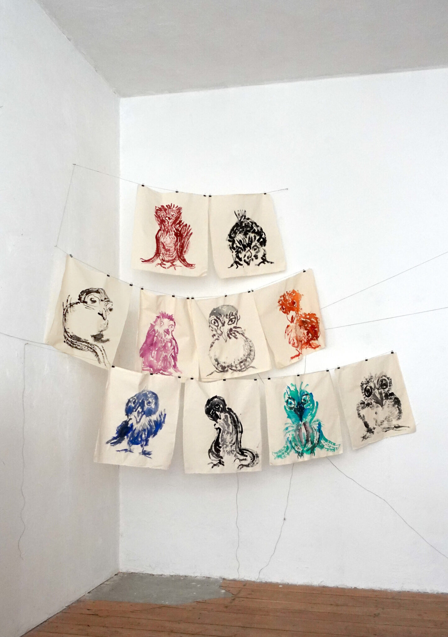 Each canvas bears the trace of an event: a beginning, an intensification, an interruption — swift, hesitant, or faltering passages. Each bird resembles the others yet remains unmistakable, unfolding its own emotional and formal energy. In their serial arrangement, they appear like a flock: polyphonic, contradictory, yet alive in their resonance.